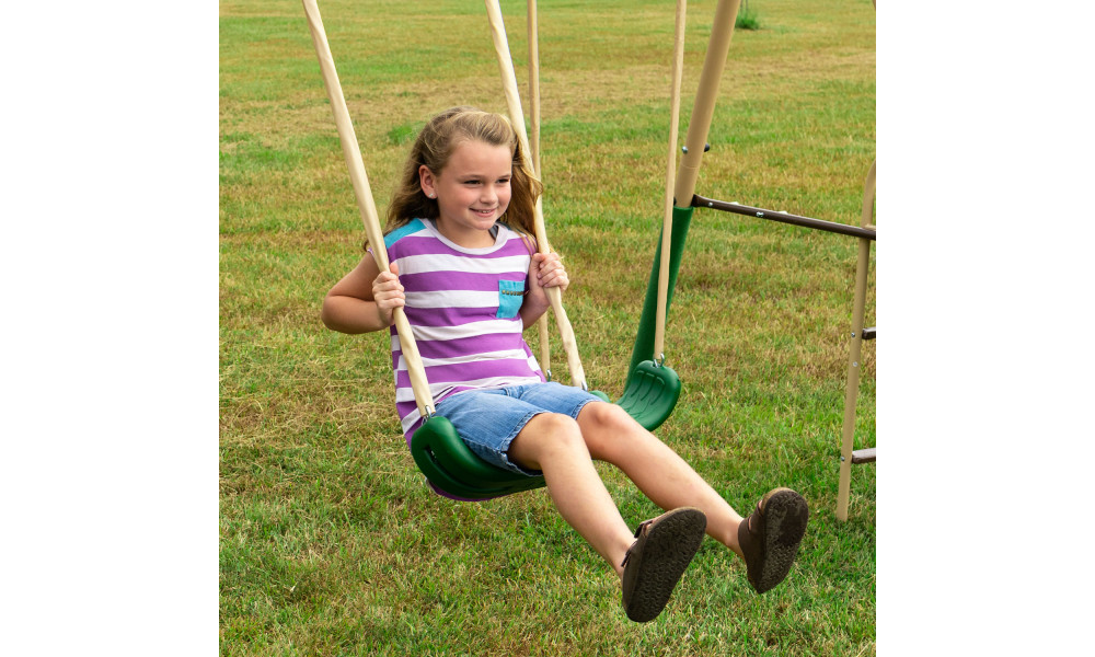 Качели и горка изготовлены из пластмассы, устойчивой к воздействию солнечных лучей. Основные стойки изготовлены из стали, в нижней части закрыты защитными трубками (poly-pade). Гайки крепления для безопасности закрыты пластиковыеми заглушками.